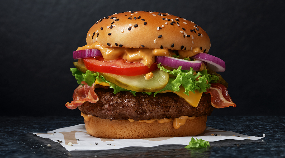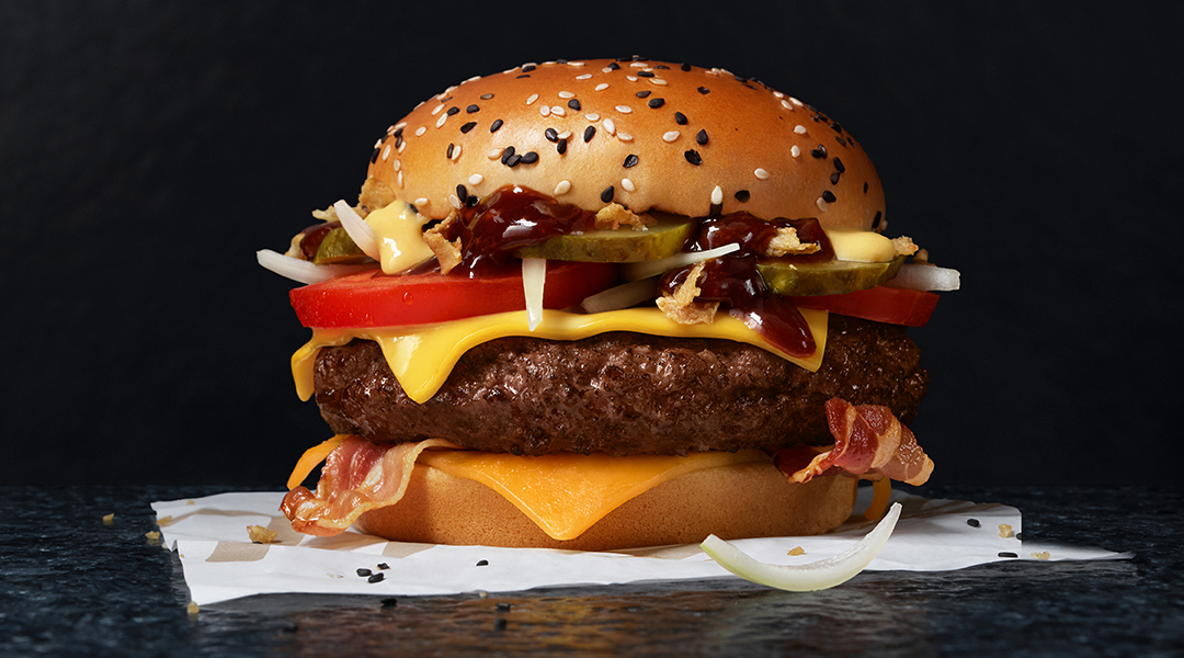 Uwielbiasz serowe połączenia? Spróbuj tego burgera! Rozkoszuj się porcją 100-procentowej, soczystej wołowiny, połączeniem serów cheddar: red i topionego żółtego, chrupiącym boczkiem oraz sosami Smoky Cheddar i Barrel & Bourbon BBQ. W dodatkach znajdziesz dojrzałego pomidora, pikle oraz świeżą i prażoną cebulkę. Wszystko to zamknięte w puszystej bułce typu brioche z posypką z białego i czarnego sezamu.
