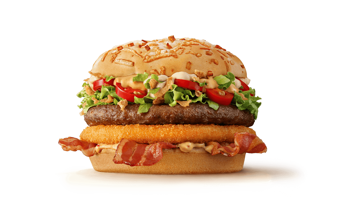 Poczujesz ciepło już od pierwszego kęsa! Ognisty sos habanero, ostre papryczki, wołowina, panierowany kotlet serowy, bekon, cebulka, sałata i bułka serowo‑bekonowa. Mniam!