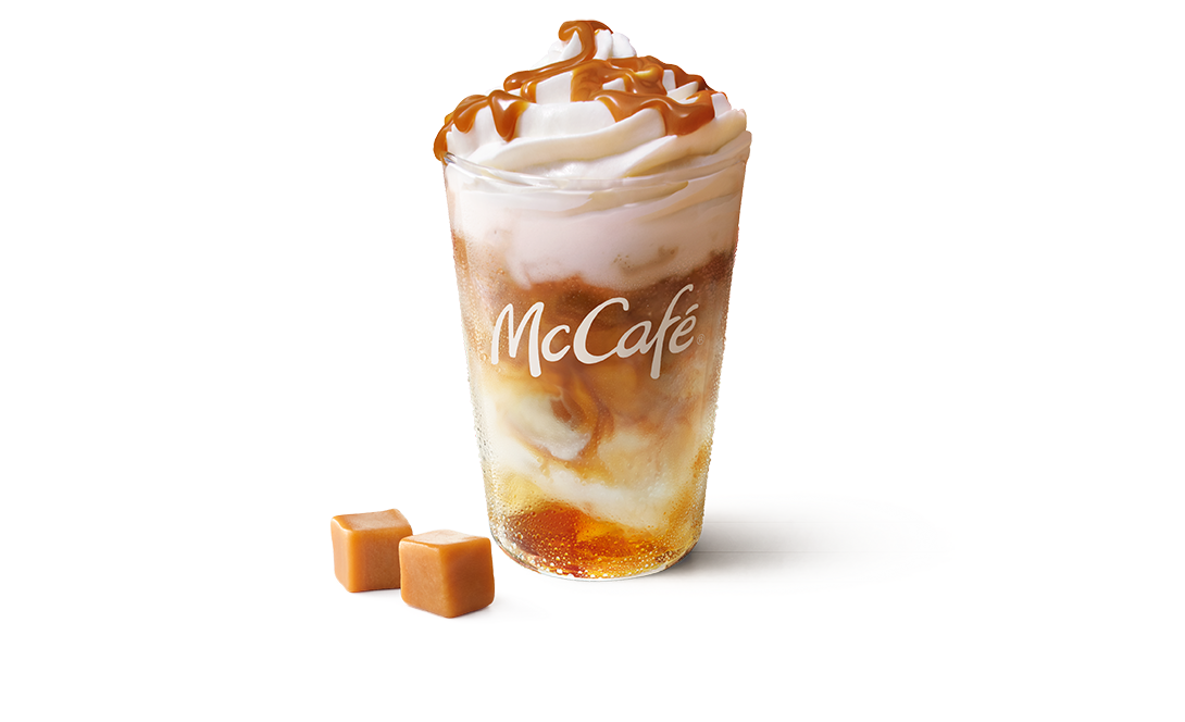 Zanurz się w połączeniu intesywnego espresso, delikatnego mleka i kostek lodu z aksamitnym syropem o smaku słonego karmelu oraz słodkim syropem o smaku waniliowym. Przypływ przyjemności to mało powiedziane! Spróbuj też wersji z bitą śmietanką i gęstym sosem o smaku karmelowym.